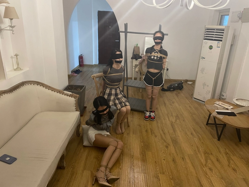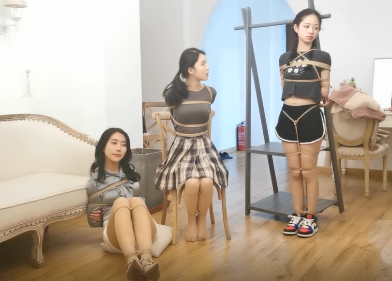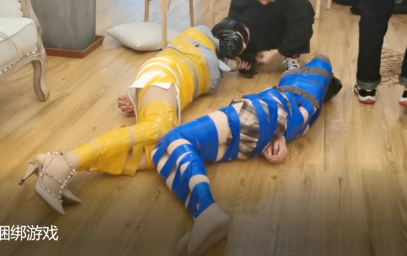 三人全部都被捆绑堵嘴蒙眼完毕后,挣脱比赛正式开始,计时5分钟,三位女生要在5分钟内完全挣脱自己身上的全部束缚,且要求必须先挣脱身上的捆绑后才能挣脱嘴巴和眼睛的束缚: