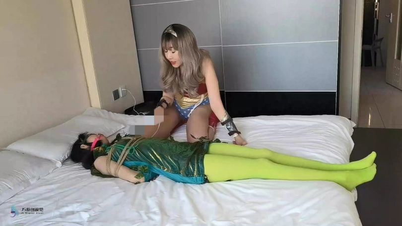 女侠将毒腾女抱进卧室,看着躺在床上的毒腾女完美的身材,激发了女侠的欲望。女侠脱去对方的靴子,捧起毒腾女的丝足开始享受的亲吻起来。拿起旁边的绳子将毒腾女捆绑起来。醒来后毒腾女不停的咒骂着女侠,女侠不耐烦的用拿起口气塞进她的嘴里。女侠从后面抱住毒腾女,不断的抚摸她的兄胸部,用棒子刺激着她的Y部,渐渐的毒腾女发出了很享受的呻吟声音。。。