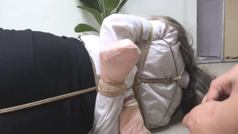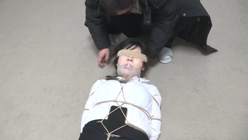 随手拿起一双丝袜从新蒙住美女的眼睛,然后跑了,留下美女在地上扭动挣扎。