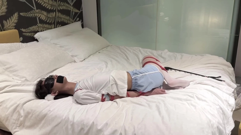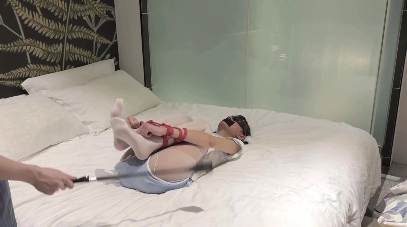 小鱼先是被红绳把手和脚分别绑在了一起 然后被举高双手双脚sp 过了一会她居然有了挣脱的念头 自己解开了绳子 解完后又被吕总给绑了个直臂缚 双腿也折起绑了起来放置 让她自己在那挣扎