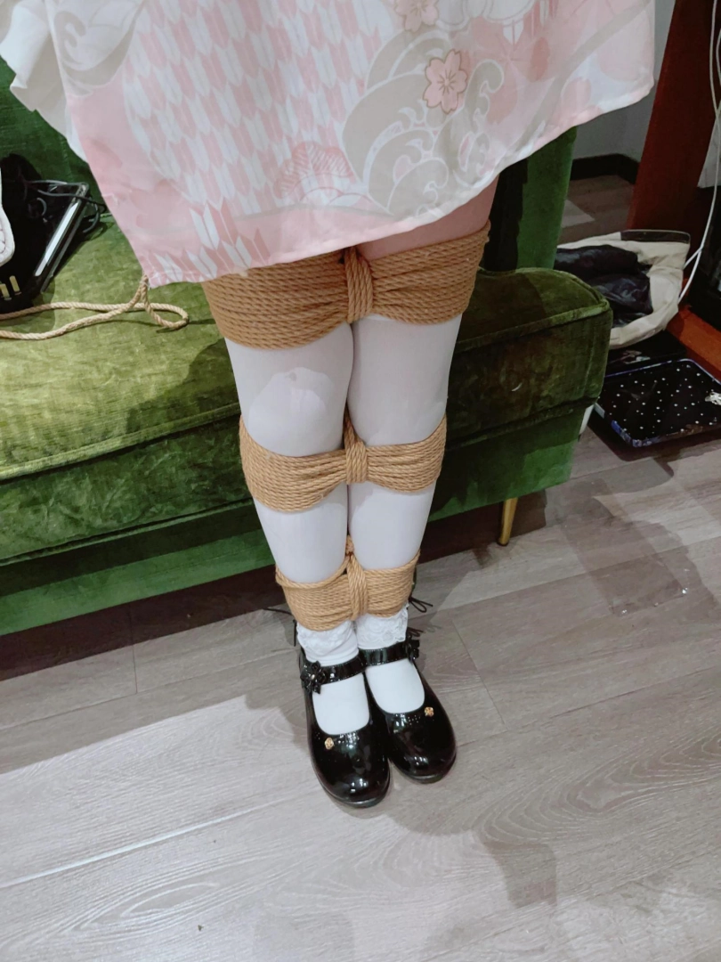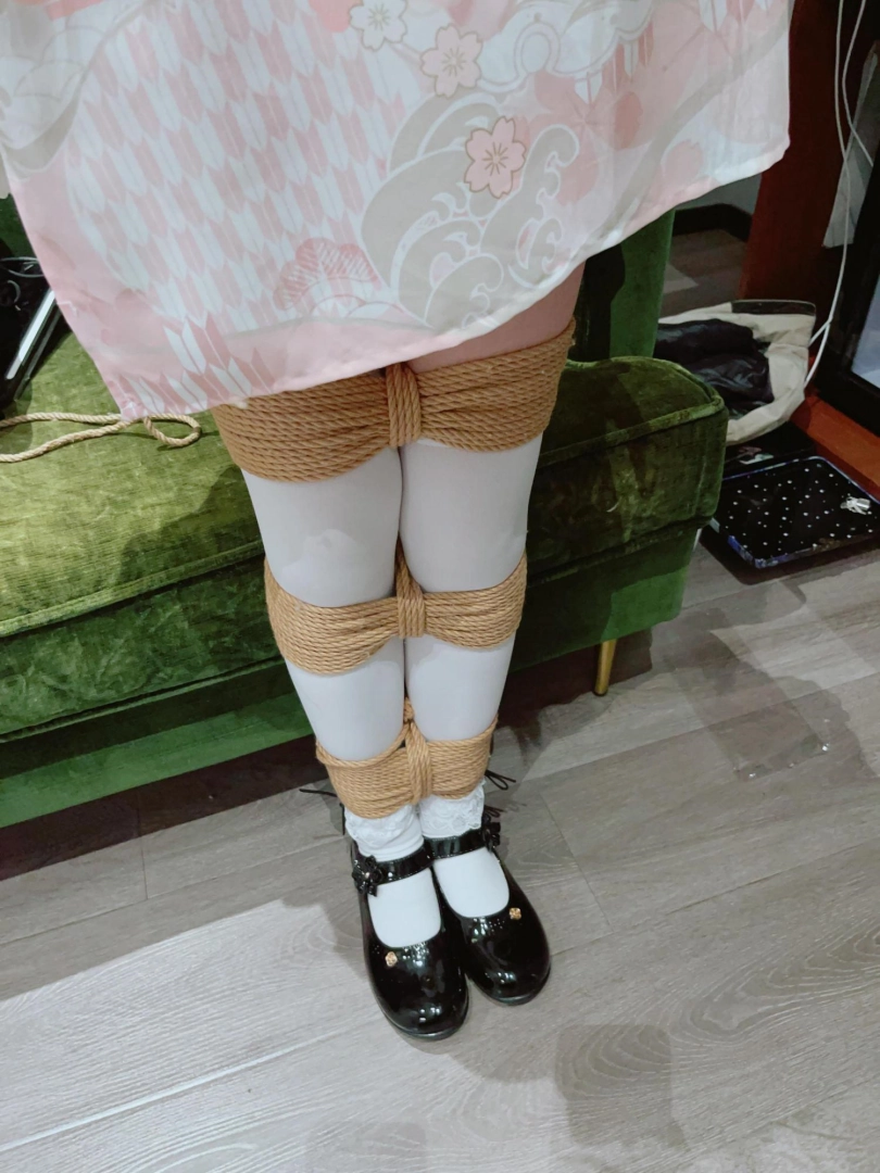 1.首先给茶茶用日式绑的紧紧的,腿的话分别在膝盖、小腿、脚腕都绑了十道以上的绳子,绑完这些后,茶茶的腿就像萝卜一样,紧紧贴合,完全没有一丝一毫分开的可能!