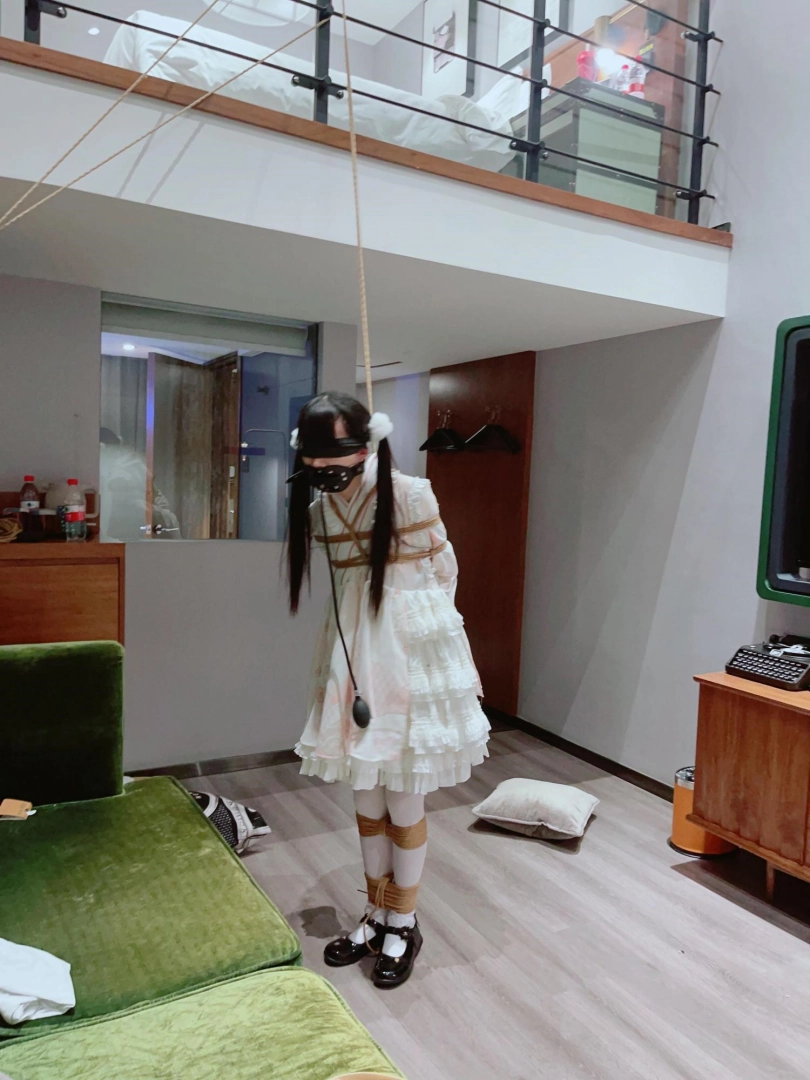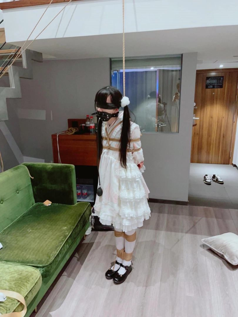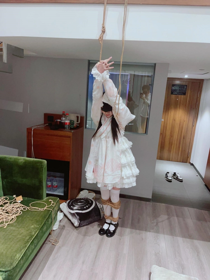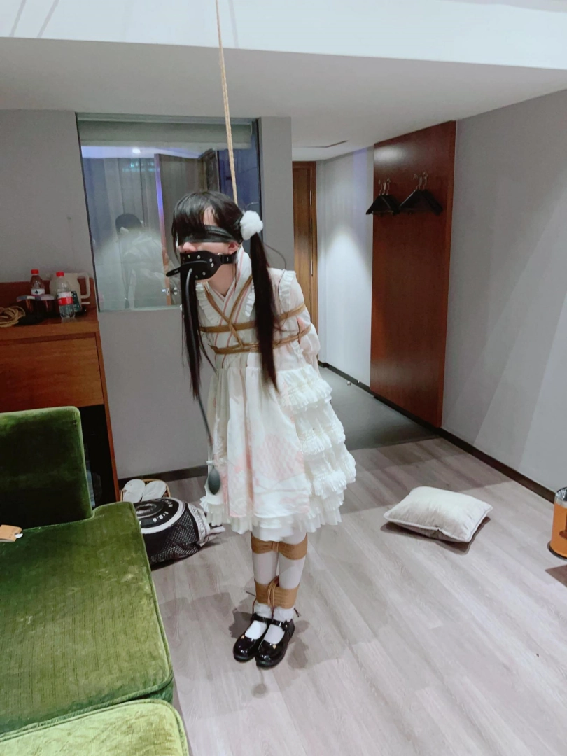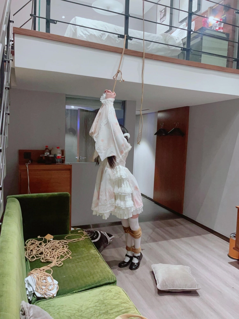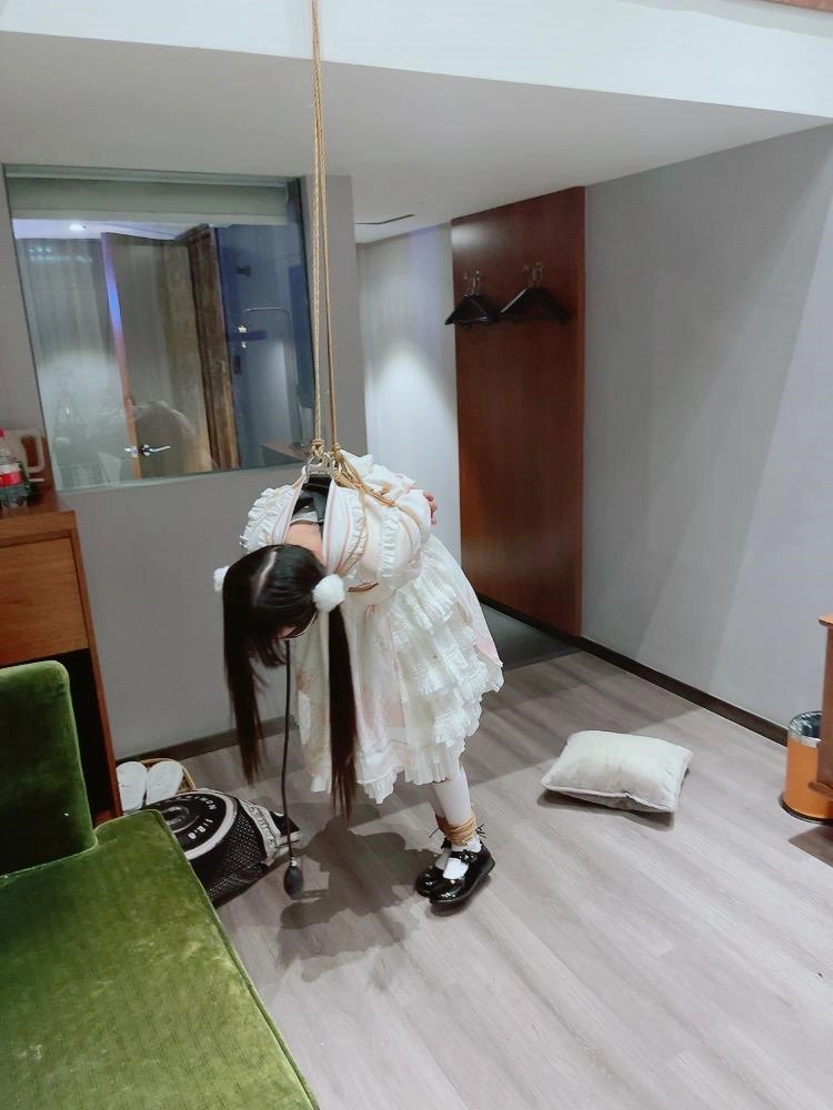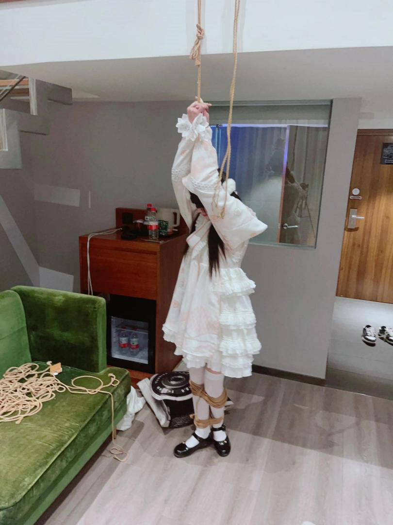 3.就这么折磨了一小时左右,茶茶突然崩溃大哭,拼命挣扎,不考虑任何重心,为了安全考虑我只能剪断了绳子,暂停拍摄。但是体力压榨不会这么轻松结束,我劝了茶茶几分钟,然后把茶茶双手举高,继续吊缚,双手举高罚站了十几分钟,直到茶茶完全疲劳绝望才放开茶茶。