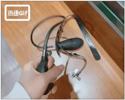 2.给茶茶戴上充气口塞,在茶茶罚站的时候捏重启口塞的气泵,让充气口塞在茶茶口腔内膨胀,填满茶茶口腔的每一个角落,这个充气口塞充满气几乎和茶茶脸一样大,连喉咙都堵满!