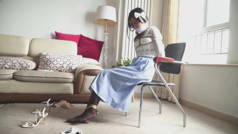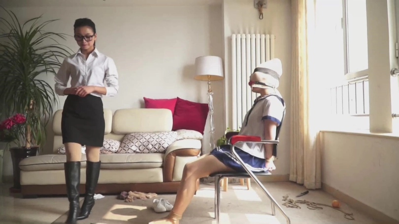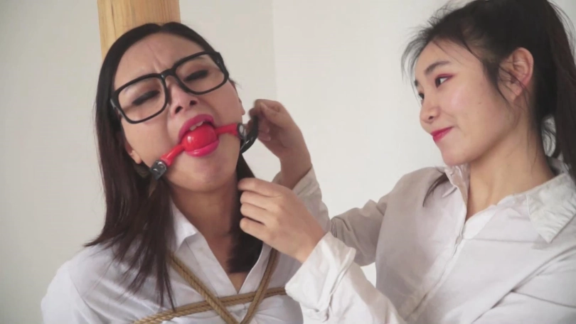 美丽的女教师文慧从昏迷中醒来,发现自己被紧紧地捆绑,嘴里还塞着自己女学生施若的原味肉丝袜。施若走了过来,解开自己嘴部的束缚,然后把刚从嘴里解下来的还沾着自己口水的丝袜勒到文慧的嘴里(一镜拍摄,没有剪辑,非常带感!)。施若抚摸了一会文慧的黑丝美腿,然后离开。文慧在房内疯狂地挣扎。终于,她用自己的丝袜脚夹到了一把小刀,割开自己的束缚。就当文慧打算解开蒙嘴的布条时,施若来到客厅。文慧拿起桌上的一个苹果冲上去塞到施若嘴里,然后将施若捆绑。接着,她解开蒙嘴的布条,又拿出了嘴里沾满口水的丝袜,用这条丝袜套住施若的头,还给施若塞上口球。