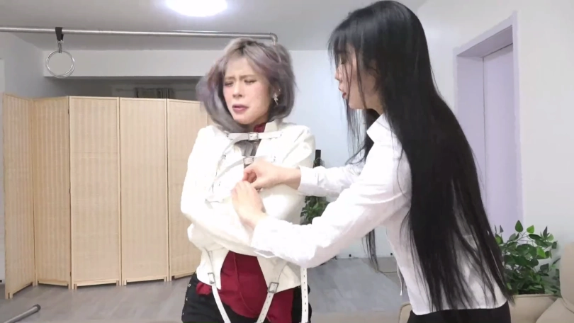 房间大门打开,护理押送着被拘束的委托人李晓梦走了进来(上身穿着拘束衣,双脚戴着黑色的镣铐。)