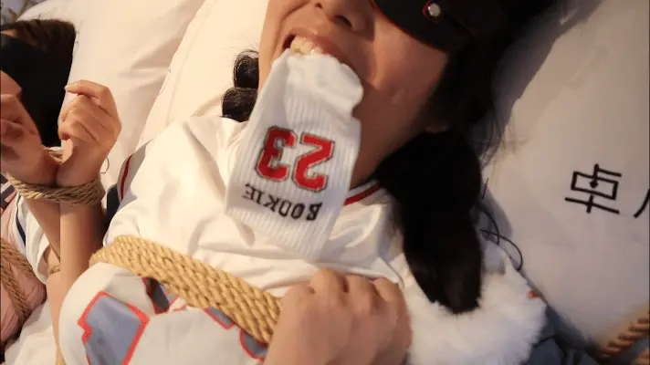 粉篮球服妹妹听到姐姐这么说,心理绝望了,但身体又被死死的绑住,