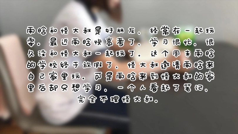 雨晗和怪大叔是好朋友,经常在一起玩耍。最近雨晗快高考了,学习很忙,很久没和怪大叔一起玩了。这个周末雨晗的学校终于放假了,怪大叔邀请雨晗来自己家里玩。可是雨晗来到怪大叔的家里后却只想学习,一个人看起了笔记,完全不理怪大叔。于是怪大叔把雨晗五花大绑了起来,雨晗却戴着脚镣又走回书桌看起了书。大叔又把雨晗的腿紧紧地绑了起来,最终雨晗疼得受不了了,答应不再学习,好好陪怪大叔玩,怪大叔才给雨晗松绑。