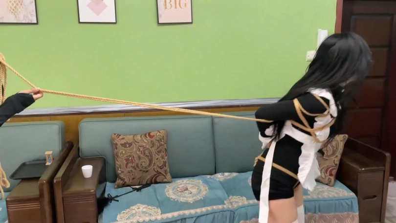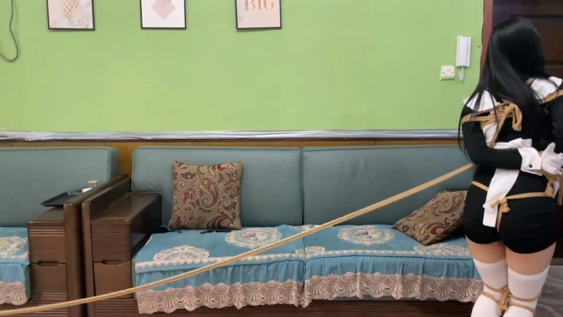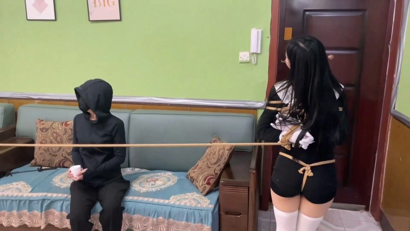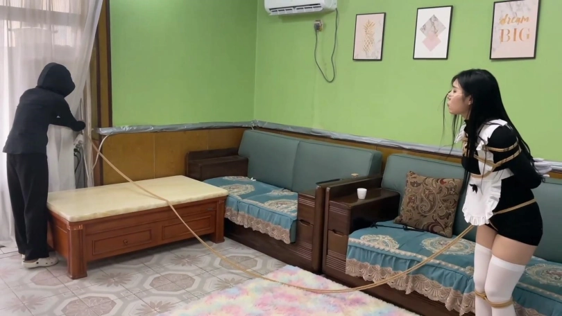 美女只能吃力的打扫。就在这时男人接到电话要离开。就拿了根长绳链接到美女身上。