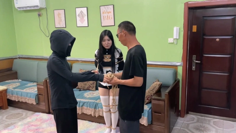 最后美女干脆演示给外卖看拴住的绳子,演示她够不到大门逃不出去,外卖总算理解了,帮忙解开了另一端的绳子。就在美女开心的想逃出房间时,却反而外卖反而拽着绳子。根本不让她往前。