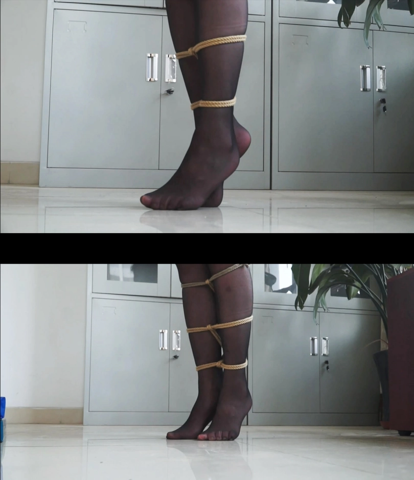 警迷迷糊糊的清醒过来,发现自己被连接着股绳吊起来,丝袜脚下放着几本厚书。