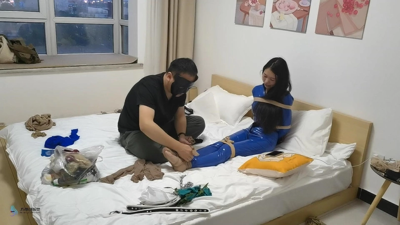 【JS】【宫怡】蓝胶衣丝袜捆绑堵嘴胶带封堵口罩丝袜头套全包鞭打挠痒