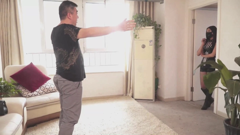 自己则是换上了王帅最喜欢的那套女王装,为了迎合王帅的口味,自己还戴上了黑色的口罩,这是他
