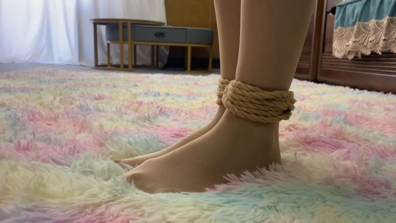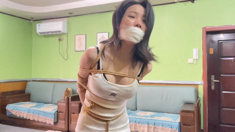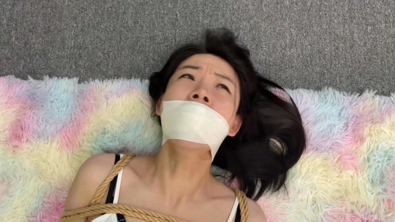挑战二:柳洋规定时间内成功吃到被丝袜团包裹的饼干。(这个挑战难点在丝袜堵嘴+泡棉胶带封嘴,效果非常好,像柳洋这么有经验的模特,也依然没有挑战成功,泡棉胶带yyds)