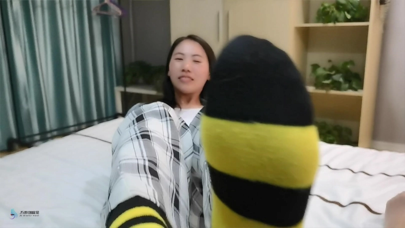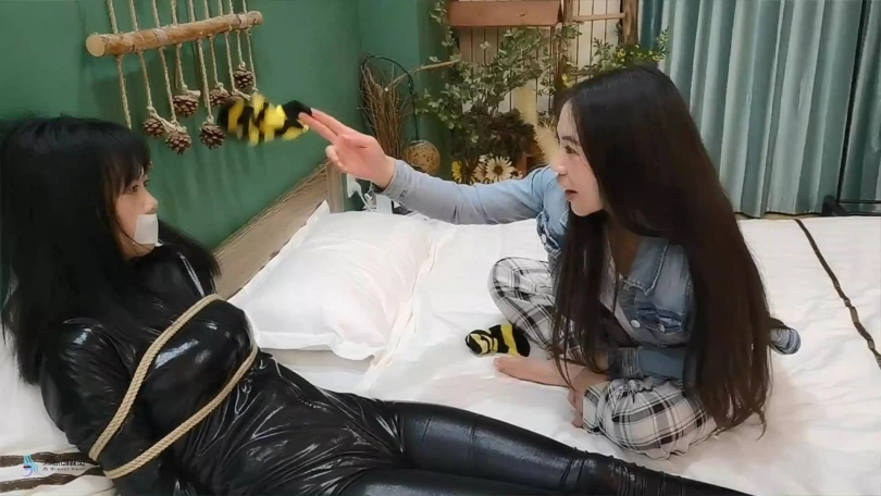 女孩在房间中被人捆绑,室友回来,并没有给她解绑,而是坏笑的脱下靴子,将她在靴子里闷了一天的棉袜脚伸向她的脸部。