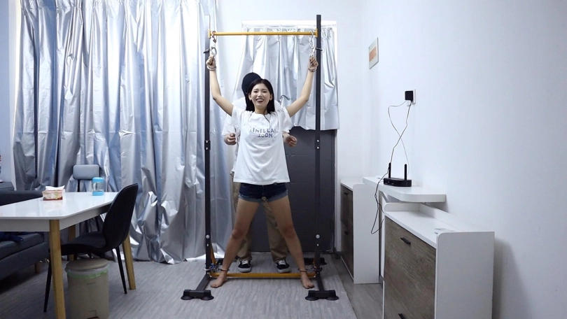 【趾间艺束】美女小欣带大家开箱新工作室 椅子缚 单杠吊铐 审讯椅 磁力绑带 挠脚挠全身TK 手铐脚铐脚趾铐