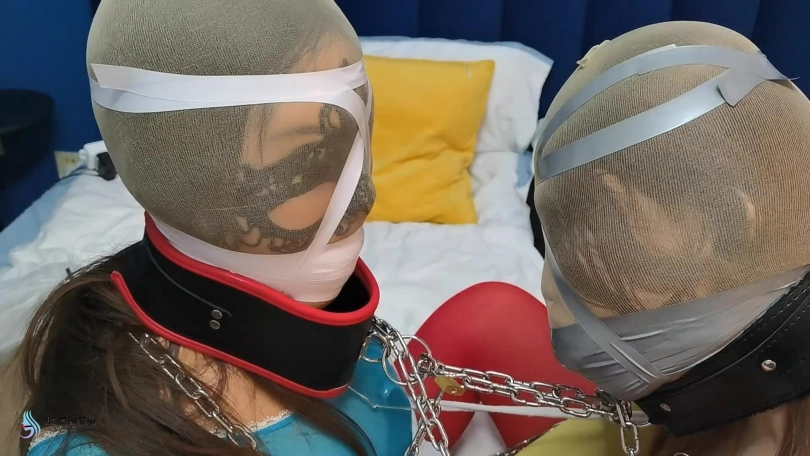 两人身上穿着五颜六色的丝袜,用胶带将她们的手缠绕,嘴里塞进丝袜,再套上丝袜头套,外面用胶带缠绕封堵,防止她们将丝袜吐出来。让她们的双腿彼此交叉,这样能使她们靠的跟进。用绳子将她们捆绑好,两人身体也被绳子绑在一起。然后给她们脖子上戴上项圈,并用铁链链接项圈,缠绕她们的身体。这样就使她们面对面的绑在一起。胸部放进去TD,刺激着Ru头,用快乐棒调到最大马力,持续不断的刺激着她们的敏感地方。很快她们身体开始抽搐起来,达到GC。