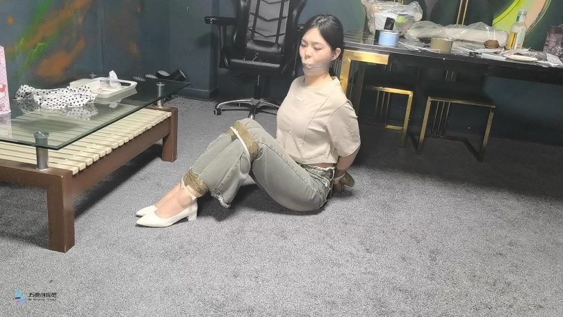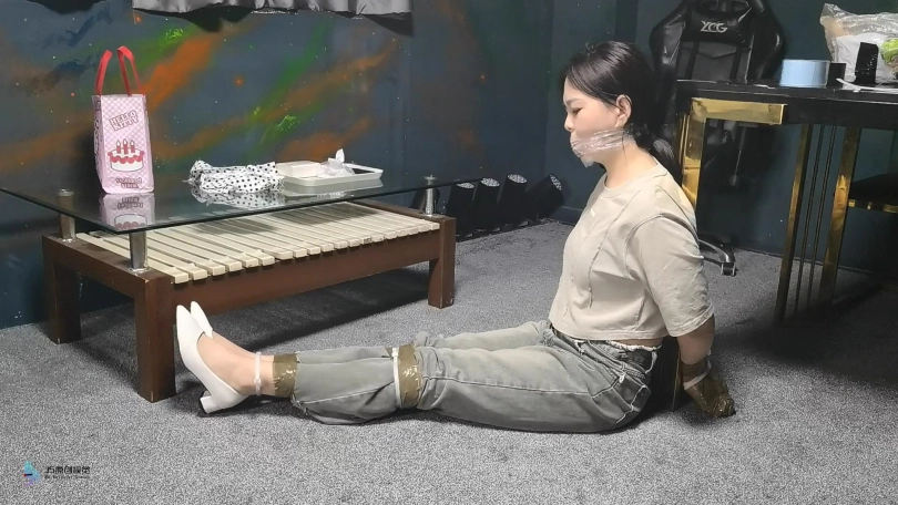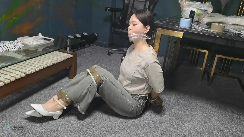 梦琪围着房子转了一圈,被人用手堵住了嘴。绑匪把她带到一把椅子上,开始用绳子把她的手绑在椅子后面。她一直在挣扎,但没有用。他把她的腿绑起来,把她的手腕和腿绑在椅子的底座上。然后他用白色的布条勒住住了她的嘴。然后他用胶带把它贴在裂口上。然后他把她的手指粘在一起。她只能苦苦挣扎。经过1分钟或2分钟的挣扎,绑匪摘下她的封口,向她要钱。她不想给他。然后他解开她的手,把她拖到桌子旁。他用胶带把她的手绑在桌腿后面,然后把拉链绑在胶带上。他对她的腿和膝盖做了同样的事。她的脚和手肘也被拉链绑着。最后,他塞了一块布在她的嘴里,用胶带缠住她。她只能苦苦挣扎。