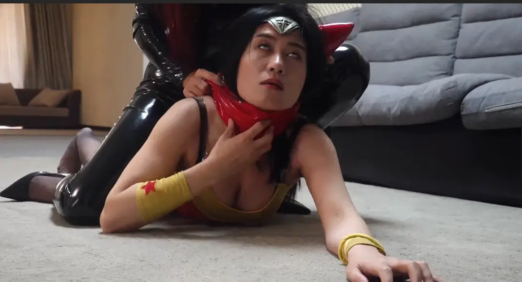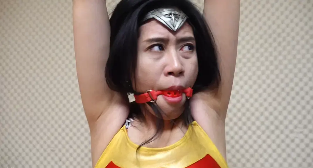 屈辱的神奇女侠被自己的战靴嘞到昏厥,醒来时却已经被吊缚起来,女魔王拿着鞭子朝神奇女侠抽去,高傲的神奇女侠居然在鞭打中哭了出来(被迫说出自己是女奴的真相)。