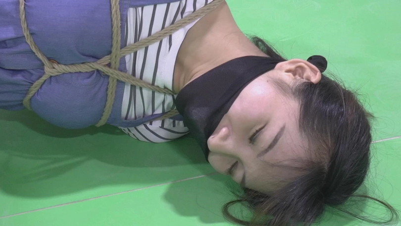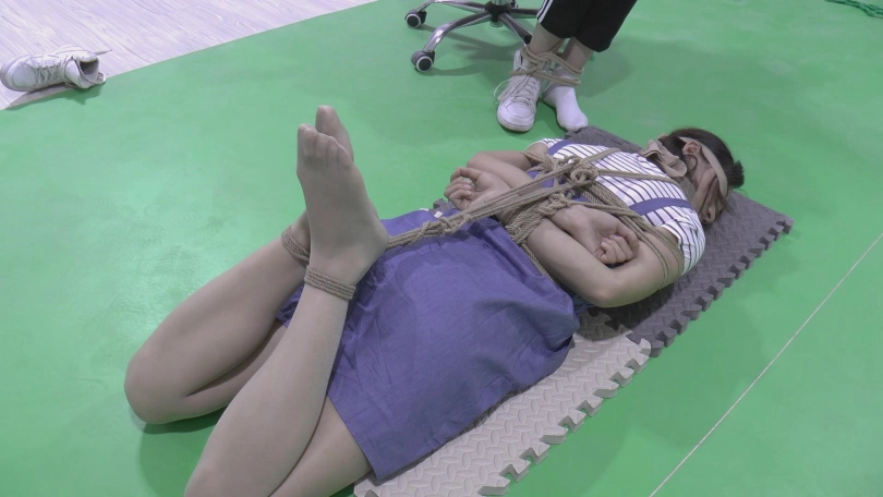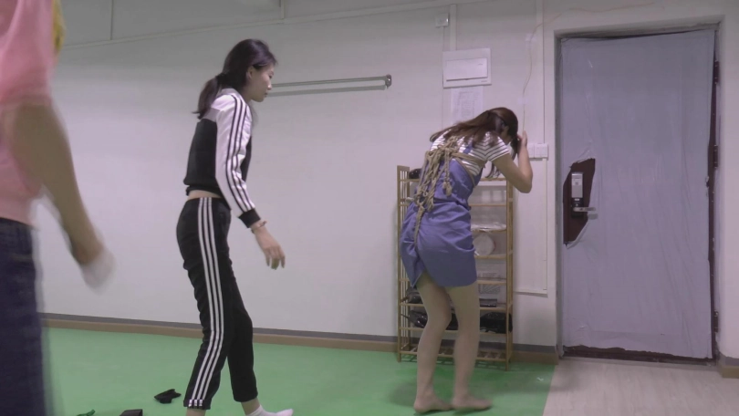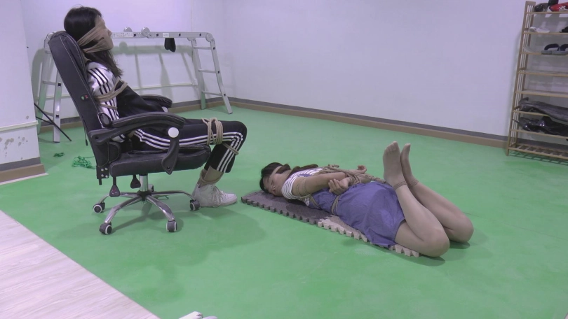 再醒过来,发现小雨被绳子绑在了椅子上,嘴里被勒着丝袜,而小文则被绿色胶带用驷马的方式绑在了地上,鼻