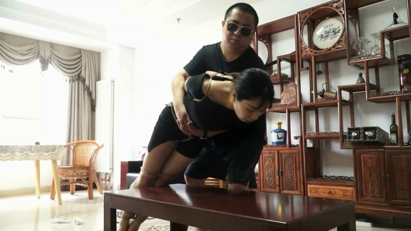 老张在地毯中央放上一张桌子,然后采用欧式直臂的方式将王蕾上半身绑好,加上股绳。最后驷马把她绑在桌子上。