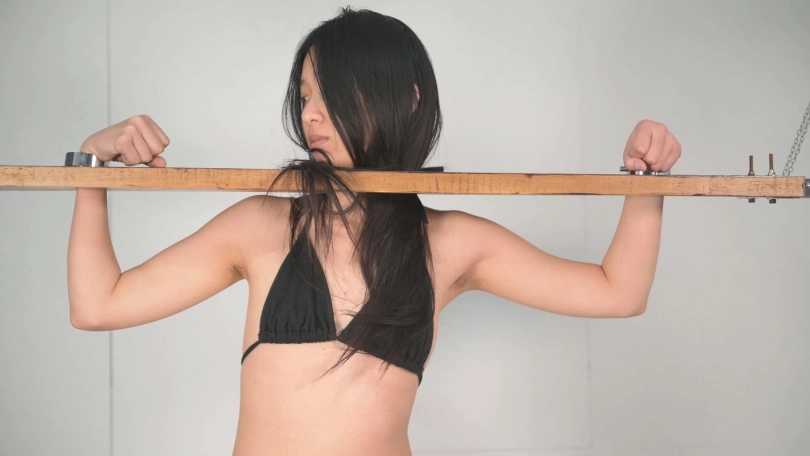 把妹子用一字木枷固定住,木枷吊起来,高度正好是妹子穿上高跟鞋并且腿分开站立的高度,脚腕则用铁链加镣铐强制分开,妹子大长腿从上面角度拍摄,依然很显长,虽然一直穿着很高的高跟鞋会很累,但妹子绝不想脱下来。怕痒的妹子这个姿势,被TK攻击只能无助承受,当把高跟鞋强制脱下的时候,妹子也只能踮起脚尖无助的扭动身体。