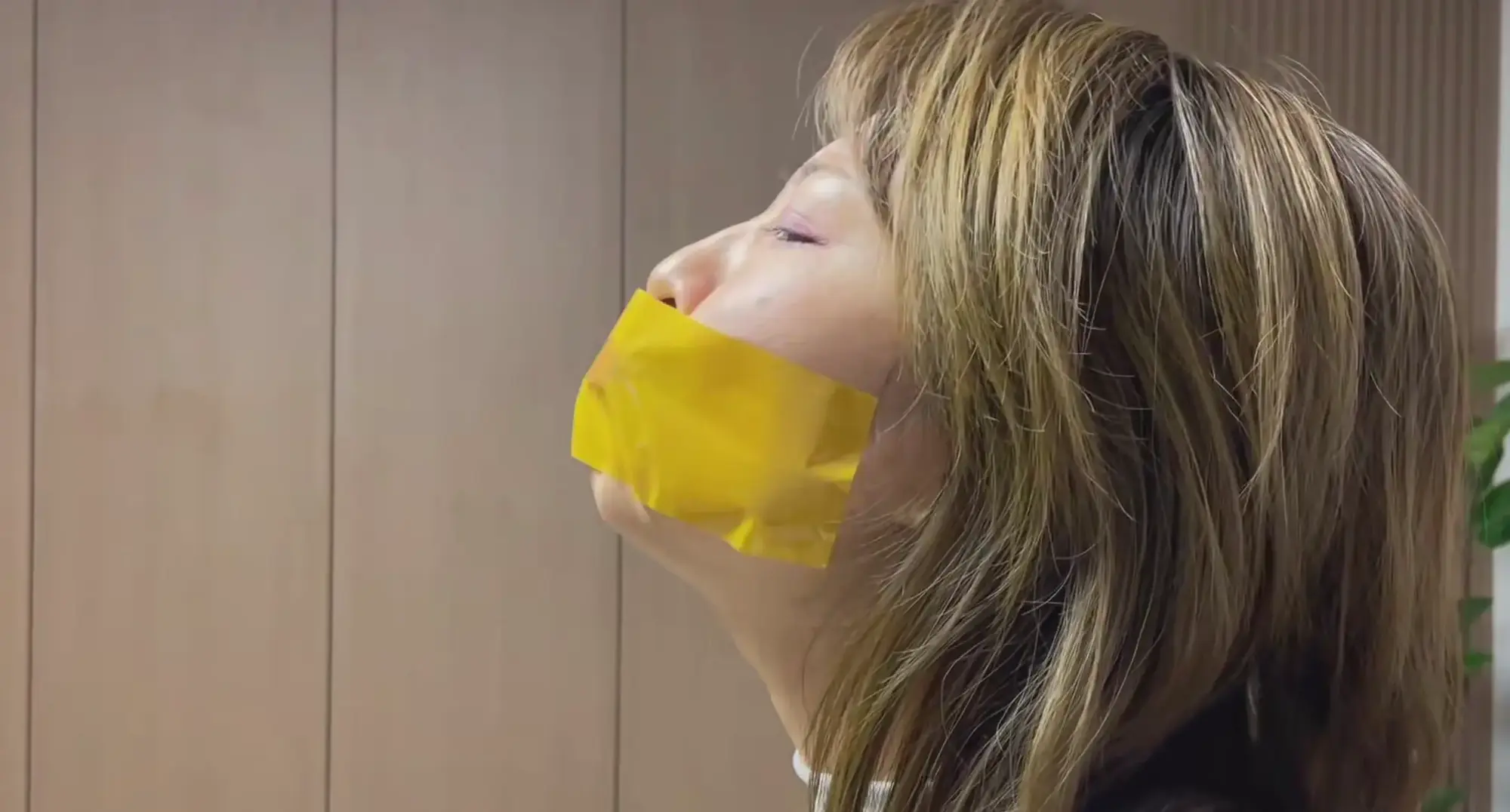 拿出黄色胶带贴合好在自己的嘴唇上,然后用丝袜把自己手正面绑住。
