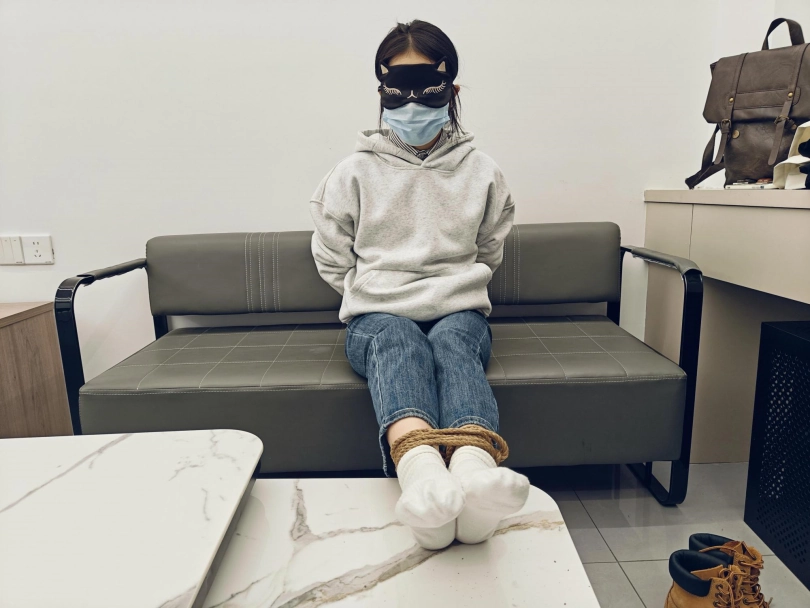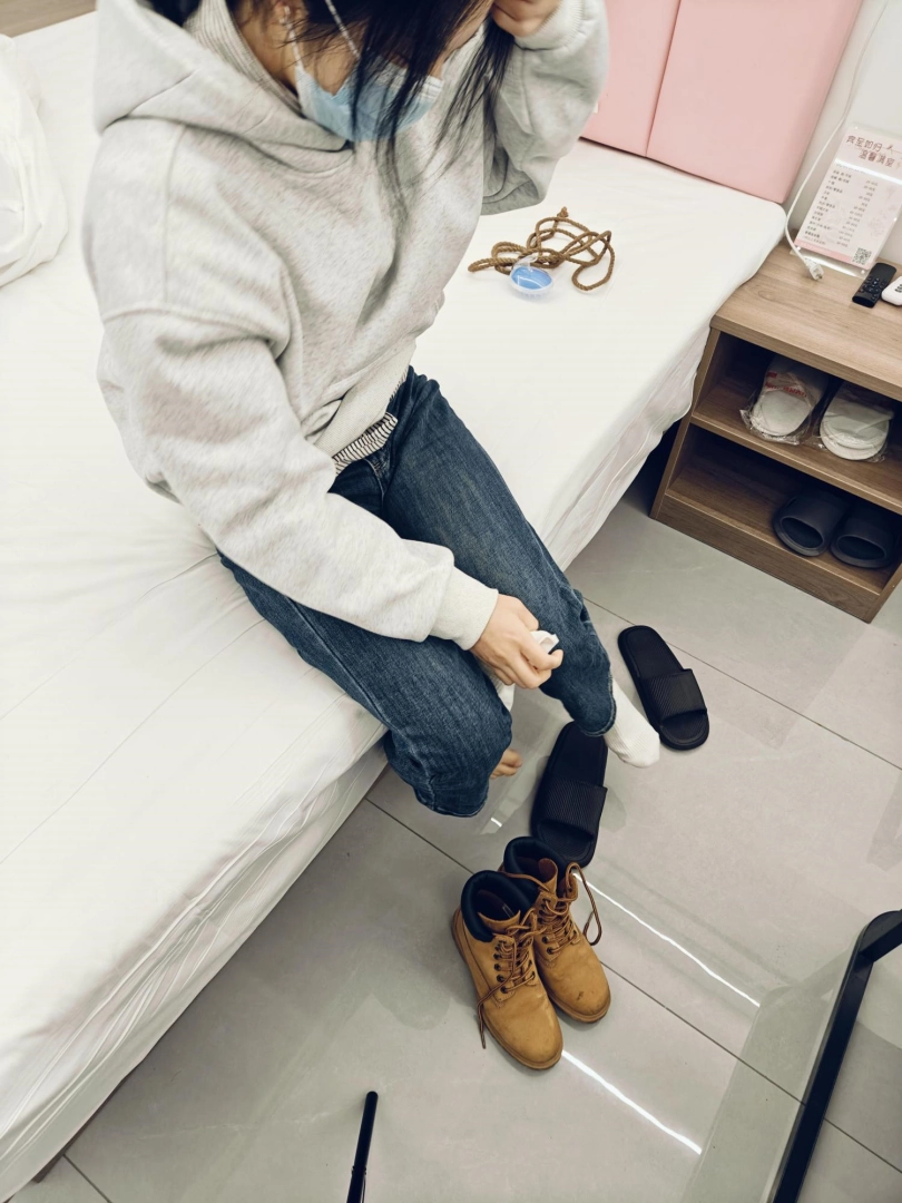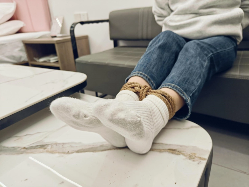 小鹿挠痒、脱鞋子的时候靴子非常难脱,小白袜有点脏,时间是下午拍摄,早早就要求穿很久的袜子,看来是穿了半天,比较怕痒的一个女生