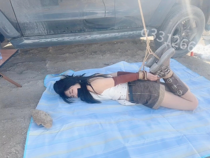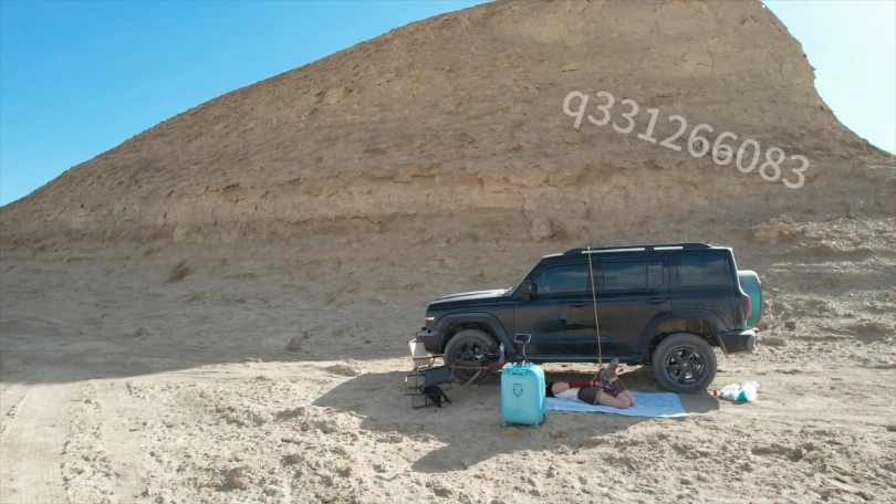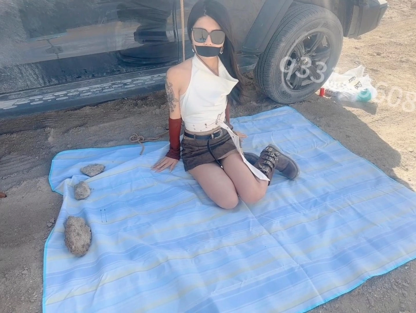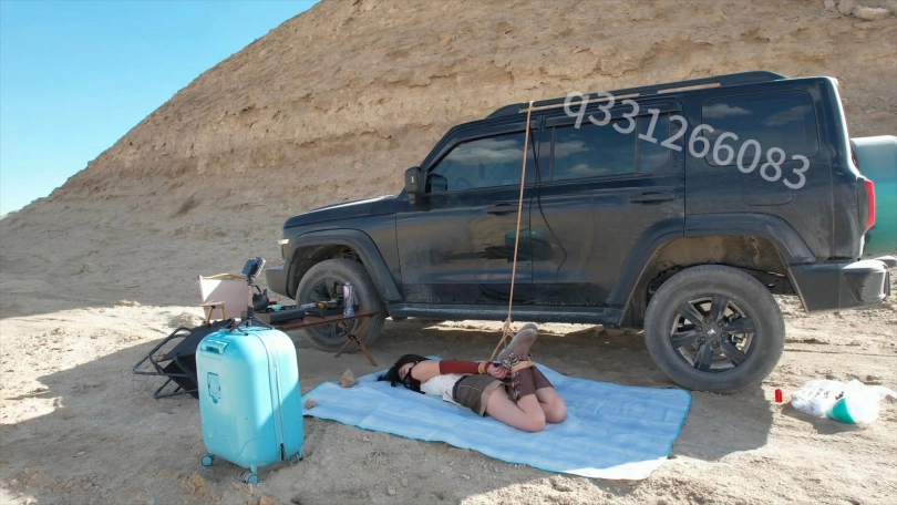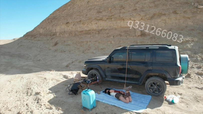 开到无人区这么荒无人烟的地方,怎么能不安排一场刺激的捆绑呢,无人机飞起来的那一刻正片就开始了,把m捆绑好之后,自己跑去喝茶,这么美的环境还是很有感觉的,感觉地球上就剩下她一个人了,而且还被捆绑着,这可怎么办