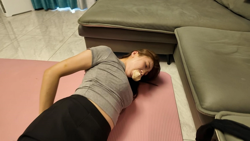 爱丝女孩在家整理丝袜,各种颜色的款式的丝袜,整理好情不自禁的用两条丝袜把自己绑了起来,谁知道刚绑好,就被偷偷进家的一个坏蛋用丝袜塞住嘴,又用多条丝袜紧紧的捆绑成驷马,抱起来揉胸,爱丝女孩只能拼命挣扎,还好这个坏蛋抚摸了一会胸就离开了,只剩下爱丝女孩在地上挣扎