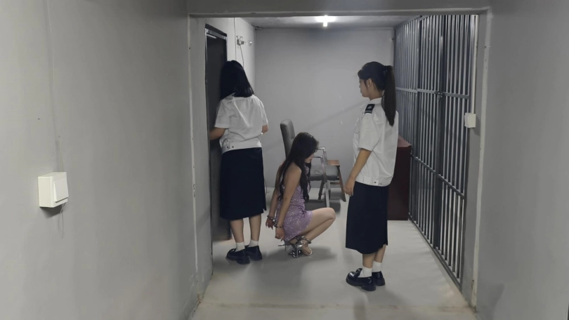 【忘忧社】模特糯糯出演女犯本系列第三部,四女囚系列之电信诈骗头目李真真在逃亡途中被抓捕,在各种审讯后终于承认了罪行,户外抓捕,手铐脚镣,30斤重脚镣让她寸步难行,高颜值模特倾情演绎
