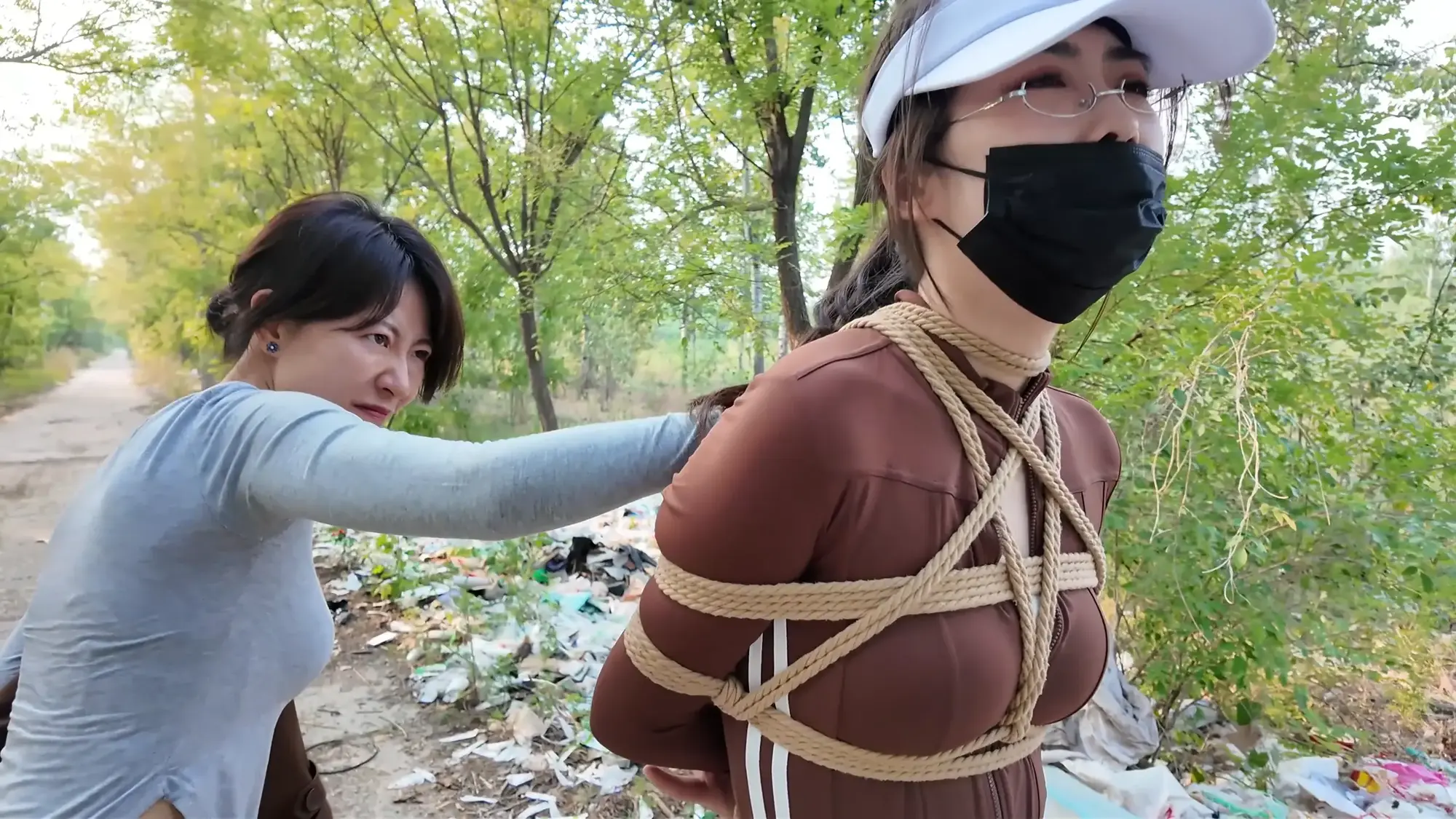 男人将汽车开到了一处空地,雨诺一直在看手机没有留意路线,她询问女人这是什么地方,女人二话不说掐住了她的脖子,前座的男人下车也上前拉扯她的衣服,慌乱之中雨诺一把推开男人,朝着远处逃跑,女人让男人先追自己在后座掏出了绳子也追了上去。雨诺边跑边喊救命,不慎被石头绊倒,两人上前控制住雨诺,女人拿胶布封嘴,男人将雨诺双手反扭,拿绳子把雨诺严严实实捆绑起来。绝望的雨诺被男人一把拽起,身边的女人拍打着她的屁股表示这次抓到的肉货身材真不错,为了保险起见女人脱下自己的外衣遮住雨诺身上的绳子,并给雨诺戴上了口罩并压着她向车走去。