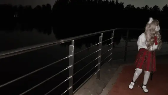 【苏苏】苏苏猫耳白丝连体手铐脚镣运河边露出+锁在栏杆上挣扎调教