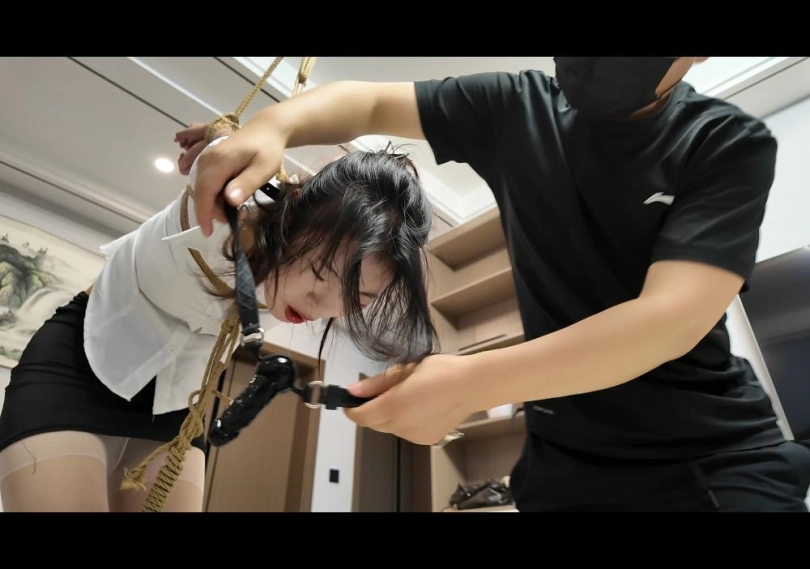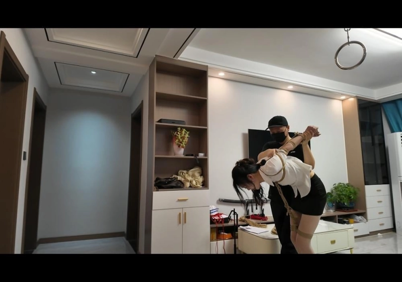 先把小夏直臂紧缚,要求必须完全并肘,小夏柔韧性还是不错的、绑好头和大腿连上、押解在屋里面来回走几趟,然后固定吊起来放置,带上羊具口塞,这个姿势可是粘考验小夏的柔韧性和耐力啊