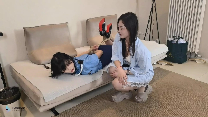 A女士开了一家主题S,M酒店,酒店房间内全是各种道具供客人玩耍。有一天,女JB小姐接到报J电话,一名入住过该酒店的客人声称酒店房间内装有隐藏摄像头,希望对其进行调查。B小姐放下电话后立即前往酒店,见到了酒店老板A女士后,让A女士带她进入房间进行调查,A女士表面上笑脸相迎,将B小姐带入了房间,趁B小姐在房内四处寻找摄像头的时候,A悄悄掏出一块沾有药物的手帕从背后一下子捂住了B的口鼻,B挣扎了一会儿后便失去意识晕倒在地。A看着躺在地上的B,喃喃自语道:“这么漂亮的女J,得好好调焦她一番才过瘾”说完便将B拖到了床上,用绳子将其绑了起来…B醒来之后,发现自己竟被驷马绑在床上无法动弹,这时A走了过来:“哟,J花小姐,您终于醒了”B挣扎了一会后愤怒地说道:“你在干什么,你这是袭J你知不知道,赶紧把我放开,不然你就等着去牢里过你的下半辈子吧”A听完笑着说道:“哎哟喂,不愧是女J呀,都被绑成这样了还是这么凶,J花小姐,你可看好了,这箱子里装的道具可都是专门为您准备的,我非得把你调焦成我的宠物不可”A说完指了指地上的工具箱,那里面装满了各种sm道具…“你个变态人渣!快放了我”B朝A怒吼道,看着地上的工具箱B的眼神里不由自主地闪过一丝恐惧。“J花小姐,你太吵了,那就先让您尝一下口球的滋味吧”A说完便从工具箱里拿来一个口球戴在了B的嘴上,之后将B的鞋子脱了下来,看着B还穿着性感的丝袜,A好奇地问道:“J花小姐,你怕不怕痒呀?”说完之后A邪魅一笑,便开始用指尖轻轻地在B脚底板上来回划着,B这时奇痒难耐,可是嘴上戴着口球,只能呜呜地低声叫着,A挠完痒之后还不过瘾,看着B的丝足竟不由自主地亲了起来,玩弄了一阵之后,A想换一个玩法,便解开了B的口球,对其说道:“J花小姐,咱们现在换个玩法,我一定会让你成为我的奴隶的”说完还轻轻地摸了摸B的头,B看着地上的工具箱,陷入了深深的绝望之中……画面再度亮起时,只见B被脱了鞋单腿吊缚在房间里,嘴上依旧被塞着口球…这时A拿着棒棒一脸奸笑走来“J花小姐,来感受一下棒棒的威力吧”说完便用棒棒对B的裆部持续输出,在棒棒的强力震动下,B很快便达到了高C…A这时察觉到B的眼神里似乎充满了享受,便取下B嘴上的口球问道:“怎么样呀J花小姐,看起来被这样对待还让你挺兴奋的嘛”B此时眼神迷离地缓缓点了点头,她此刻似乎已经忘记了自己来酒店的真实目的…A看到B已经不再反抗,便将她的绳子解开让她乖乖躺在地上,B听话照做,A脱下鞋后便用自己穿着黑丝的脚在B身上不停划来划去,还踩在B的脸上,最后用脚不断摩擦B的裆部挑逗着她…A看着B一脸坏笑说道:“我这工具箱里还有一些东西想让J花小姐体验一下呢”说完便从箱子里拿出来项圈狗链还有小皮鞭,给B戴上了项圈之后A说道:“好了,我的乖小狗,主人带你散散步吧”说完便让B趴在地上,用狗链牵着B在房间内来回走着,一边走还时不时用小皮鞭抽打着B的屁股,走了几圈之后,A让B跪在床边,A坐在床上伸出脚来插进B的嘴里,并让B伸出舌头不停舔着她的脚,“现在愿意做我的宠物了吗?”A满脸笑容地问道,B此时也笑着点了点头……画面再次亮起,A躺在床上用狗链牵着B,B此时正在给A捶腿按摩,“舒服吗,主人?”B问道,A欣慰地笑着点了点头,而此时B身上穿着的也不再是那身象征着正义的J服,而是主人为她精心准备的可爱女仆装……