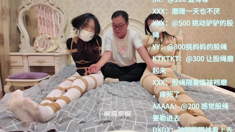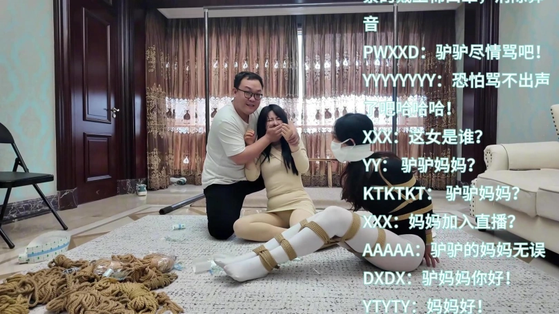 此时驴驴的妈妈回到家中,见到疯狂粉丝正在猥琐驴驴,露出了震惊的表情。 妈妈想出手制止,但是疯狂粉丝竟然也把妈妈也捉住了起来拉到镜头前,向直播间的粉丝们表示妈妈也参与直播。粉丝们在直播间表示雀跃,纷纷打出留言和课金,要求两母女一同作一次羞耻的直播。