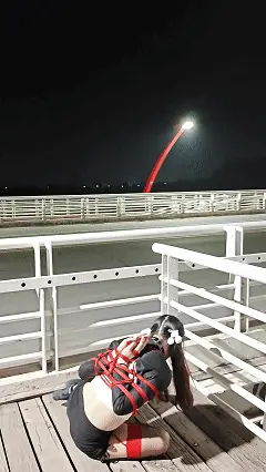 之后露露被带到天桥下,在长椅上继续折磨电击,随后便拿出包里的道具————野餐垫、眼罩和一捆绳子,露露现在要被海老缚放置在无人的公园草地!