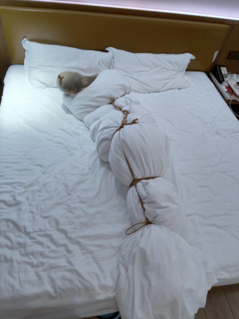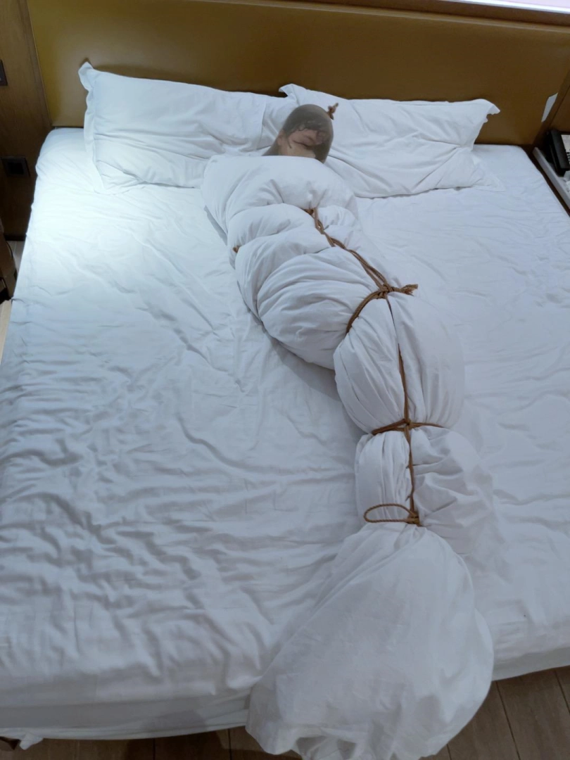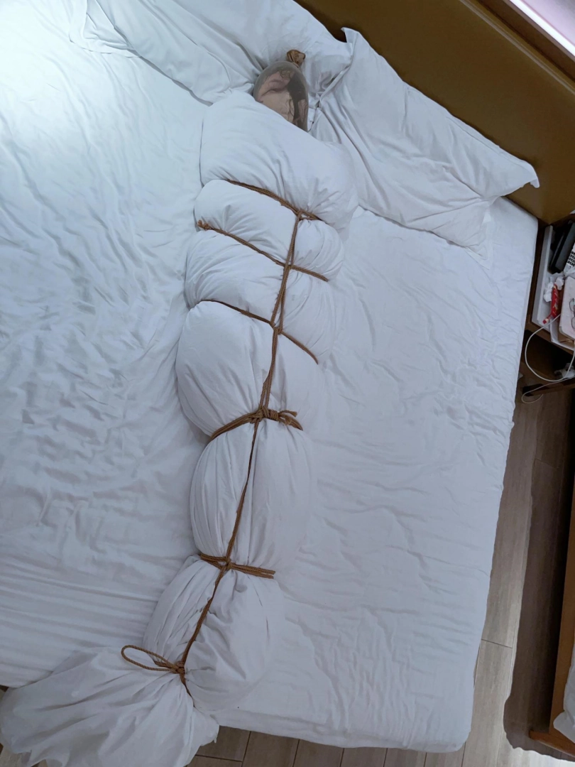 第四层拘束——棉被:把棉被铺开,让妹子躺在上面,然后用棉被卷好裹紧,只露出被丝袜包裹的头部。