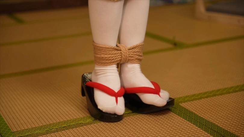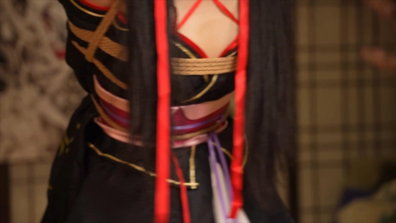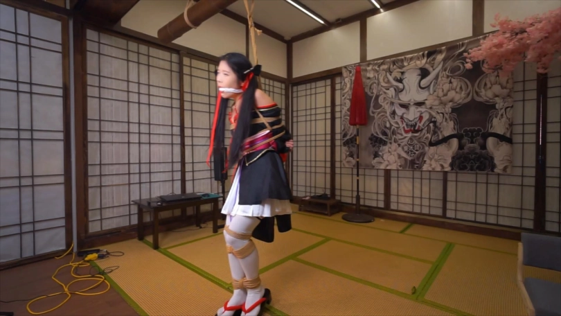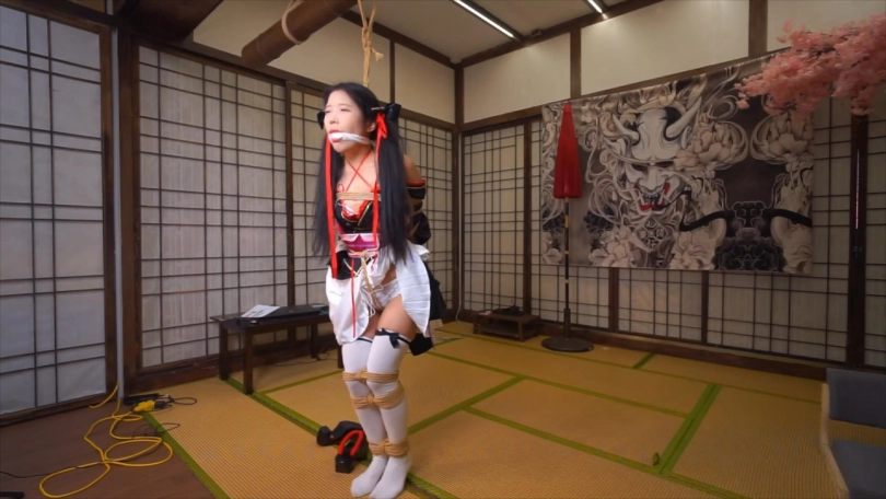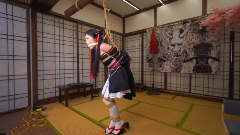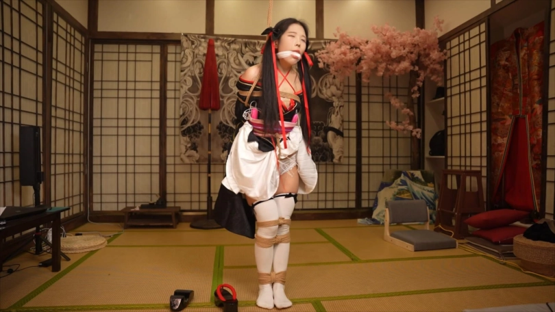 下半段的内容是踮脚吊缚,这是我最喜欢的姿势之一,能让模特被绑起来后处在微妙的平衡与不平衡的动态循环中,模特要始终集中注意力,稍微不留神就会保持不了平衡身体往一边倒,有因为身后的绳子拉住倒不下去,观赏性极佳。后半程专门安排人给娃娃扒开衣服撩起裙子,往两胸各塞了颗蛋,下面也绑上股绳和塞了颗动力强劲的蛋进去,给娃娃爽得不要不要的gc了。