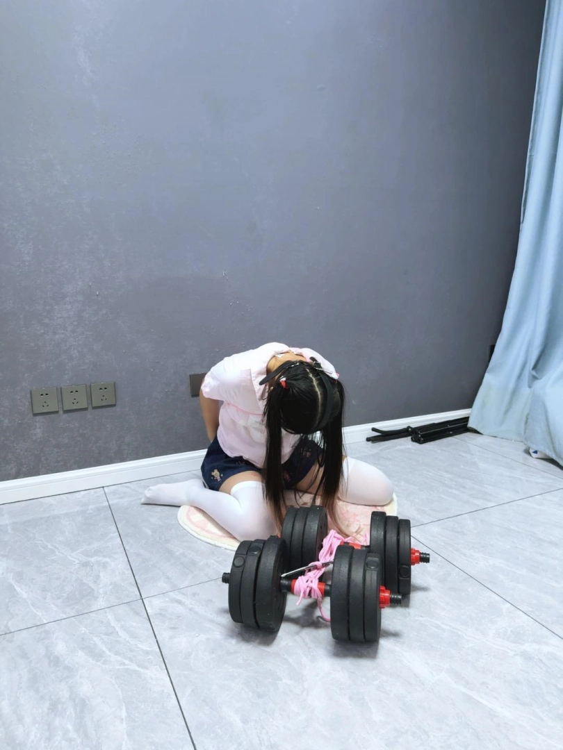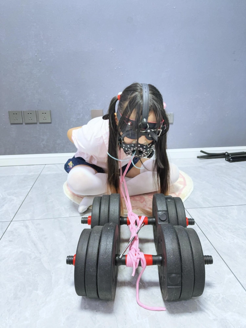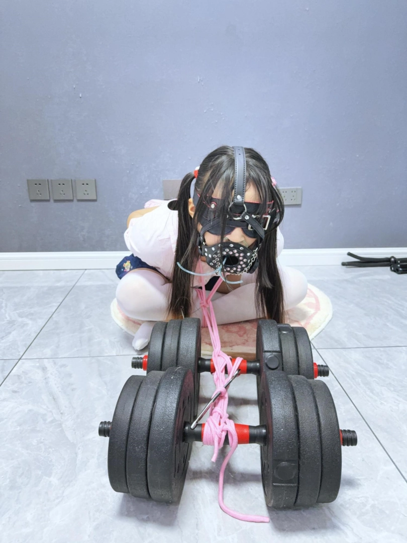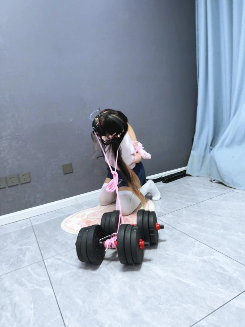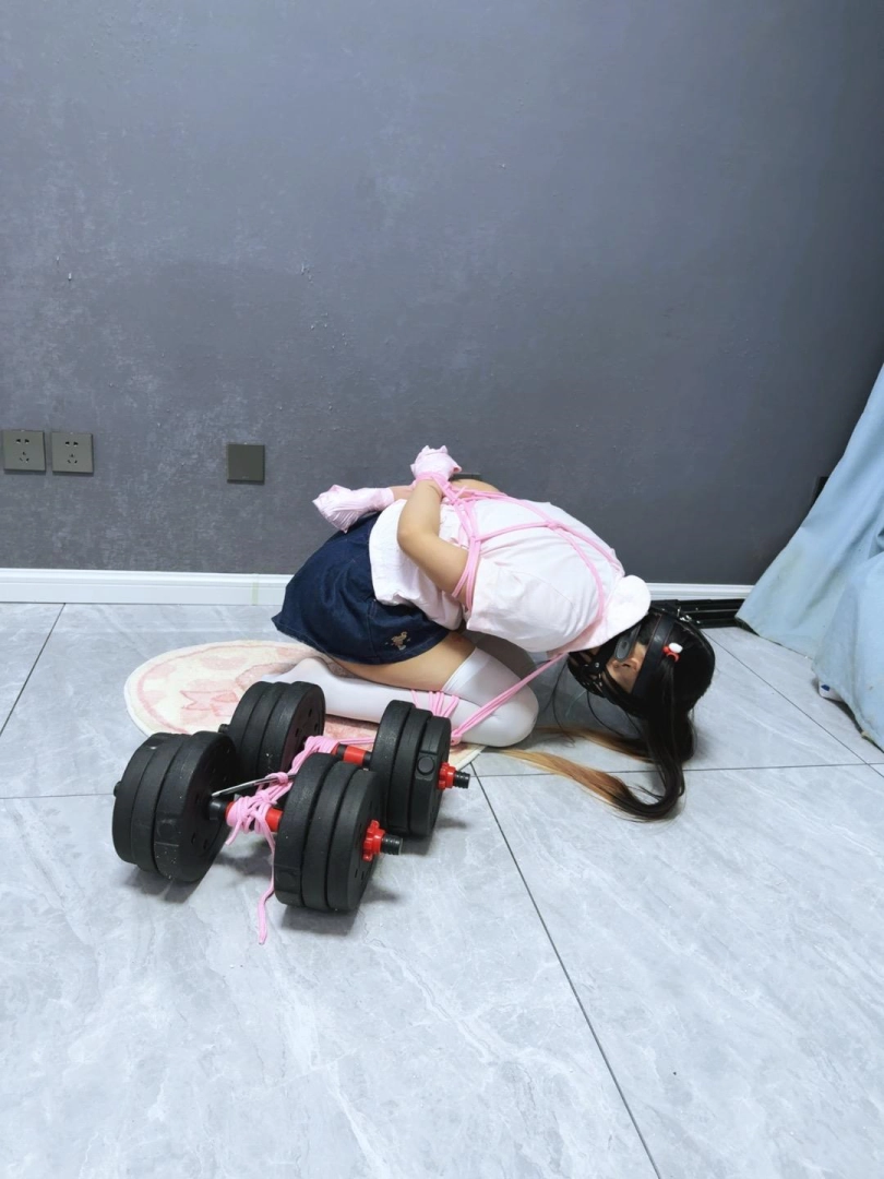 【全身拘束】:上半身用粉色棉绳绑日式,然后全身束缚成海老缚,盘腿拘束后,在脖子下方连接两个20kg共40kg的哑铃,并且把剪刀固定在哑铃上!