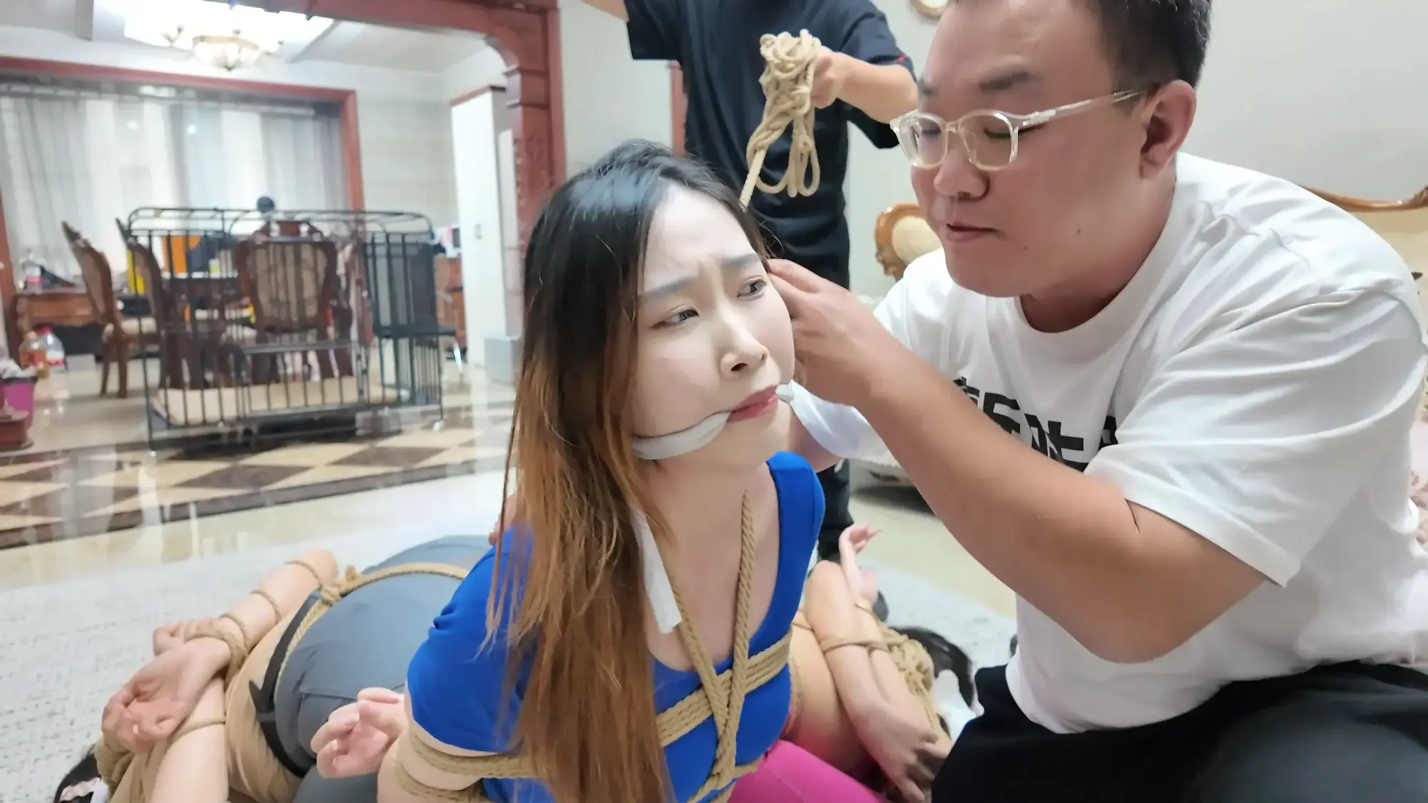 画面一转,雷姐被松开绳子,脱去了外衣,大哥用绳子将雷姐后高手紧缚,并将股绳用力绑上,痛得雷姐直叫,大哥见雷姐还是不肯屈服,便开始拉扯雷姐手臂的绳子,由于后高手绑的很紧,雷姐被绳子勒的非常痛,于是求饶,大哥见雷姐示弱,依旧没有停手,又开始恶趣味的拉扯雷姐的股绳,雷姐难受的大叫。于此同时,一旁的e小姐与南清再次被驷马捆绑放置在地上挣扎,e小姐环顾四周,发现了掉落在角落里的手枪,她短暂思考了后暗自窃喜,刻意大笑了起来,大哥甩开雷姐松开了e小姐的口球,质问她为什么笑,雷姐用挑逗的语气表示这么瞎折腾太浪费体力,耽误办正事,大哥乐呵着问e小姐是不是想替雷姐受罪,e小姐回复只要不伤害她,就随他们处置,见e小姐这么顺从大哥兴奋了起来,他站起身一拳将雷姐锤倒,抱起e小姐进了卧室。e小姐躺在床上用脚不停挑逗大哥,失去理智的男人慢慢凑近了e小姐,却不料e小姐突然一头将他撞倒,并顺势用手掐住了他的脖子,男人奋力挣扎还是被杀,e小姐挣脱了束缚缓缓走出卧室,见到小弟还在玩弄雷姐和南清,雷姐与南清看到挣脱束缚的e小姐,不停喊叫,但嘴被口球塞着无法说话,没有察觉的小弟被e小姐从背后扭断了脖子。e小姐开始玩弄两人,她先是抚摸雷姐的大胸,拉扯她的股绳,然后拍打雷姐的屁股,最后去另一边玩弄南清的脚与腿。过了一会儿,e小姐表示自己已经玩够,该带两人上路了,她捡起地上的手枪后突然神情凝重,呵斥躲在角落里的人出来。一位面具人现身,他夸奖了e小姐的本领,几番对话后e小姐得知神秘人是来劫货的,神秘人表示她们三个女人一个也逃不了,e小姐自信的举起枪准备了解了神秘人,却不料神秘人一发石子就将手枪打落,e小姐刚准备捡枪,神秘人已经冲上前一脚踩住,e小姐急忙后退,才发现眼前神秘人实力深不可测,接着神秘人又一发石子击中e小姐的腹部,他向前掐住跪倒在地的e小姐,用绳子将e小姐再次绑了起来。