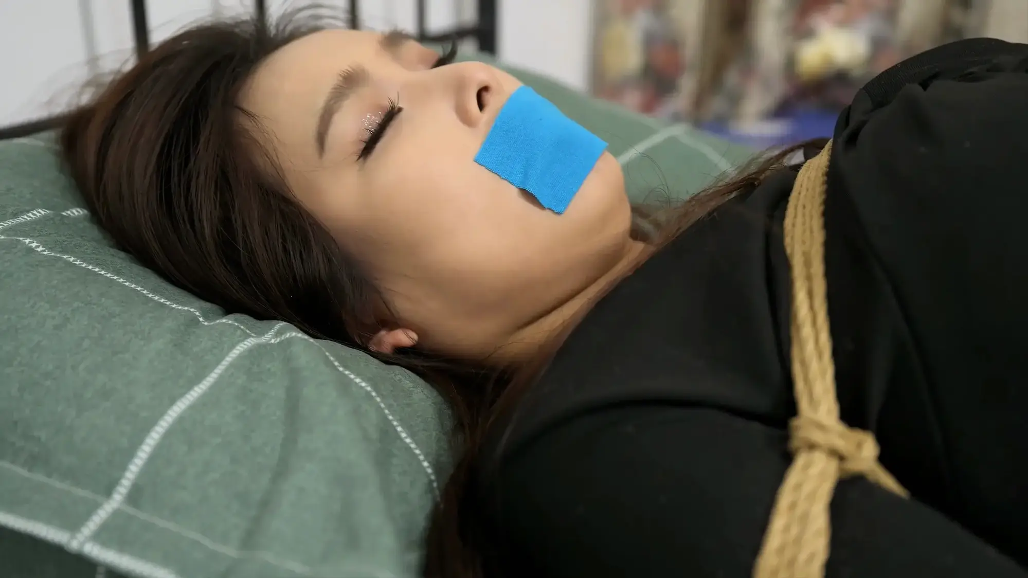 一波三折,先是第一部的直臂让雪碧苦不堪言,这一趴拍着拍着人家竟然睡着了,而且是在用了4mm麻绳紧缚的情况下,打呼噜那种睡眠。话说,她睡觉还真安稳,被捆着安安静静的,打呼噜的声音很轻柔,如果睡她旁边完全可以接受,睡着的样子也是睡美人级别的,如果我是片中的员工角色,我一定要在她被捆着的身边睡足一天一夜!