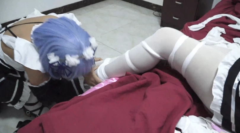 【逍遥】Cosplay拉姆雷姆之[雷姆的陷阱 - 上]雷姆用数十条丝袜设计捂晕绑架了另一个姑娘,并强迫她接受她拉姆的角色。不屈服的拉姆被迫接受捆绑,窒息捂,乃至强吻亲脚的惩罚