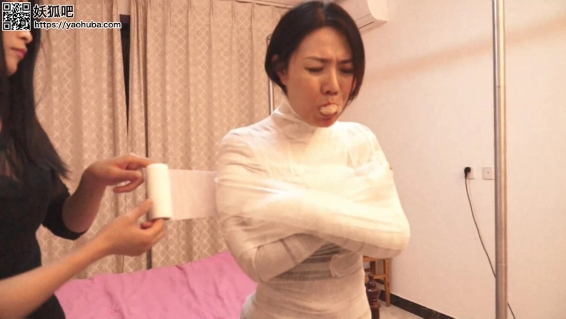 两人合力把李然包了一层后,生怕一层的包里不够,再用绷带把李然的上下身再包多一次。这时李然全身已经被包了两层的绷带完全不能动弹。男劫匪拿走李然口中的裤袜,警告给李然如果再骗他们,不然下一次就卖她给人口贩子。李然向劫匪们表示也没有必要把她包成这么严密,自己不是什么猛兽。夏炎在衣柜拿出子条新的黑色裤袜一下全堵进李然的嘴里,说这是惩罚,不得抗议!