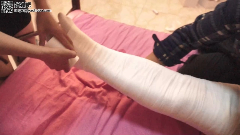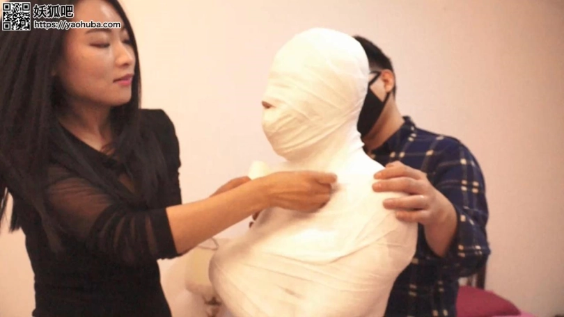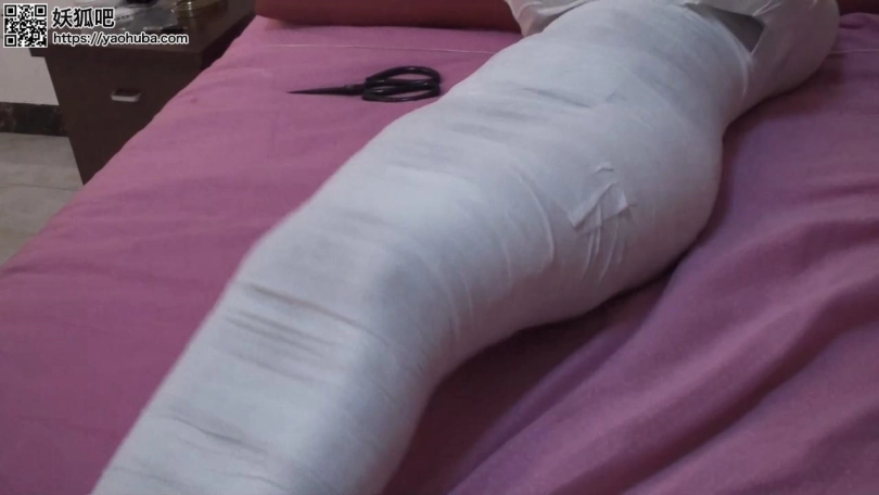 李然双腿拼拢,夏炎脱下李然腿上的袜套,然后用绷带从李然的脚踝开始往上缠绕,过程中不忘抚摸李然的双腿和婀娜的身躯。而同一时间,男劫匪从李然的手指开始用绷带包起来,然后就是整条手臂。左右手臂被分别包裹后,男劫匪要求李然把双手交叉的放在胸前,然后从李然的双膊开始包起来。他怕包裹不够严密,用上了多圈的绷带将她的上身包成洁白色。