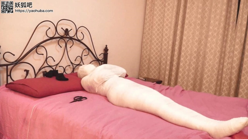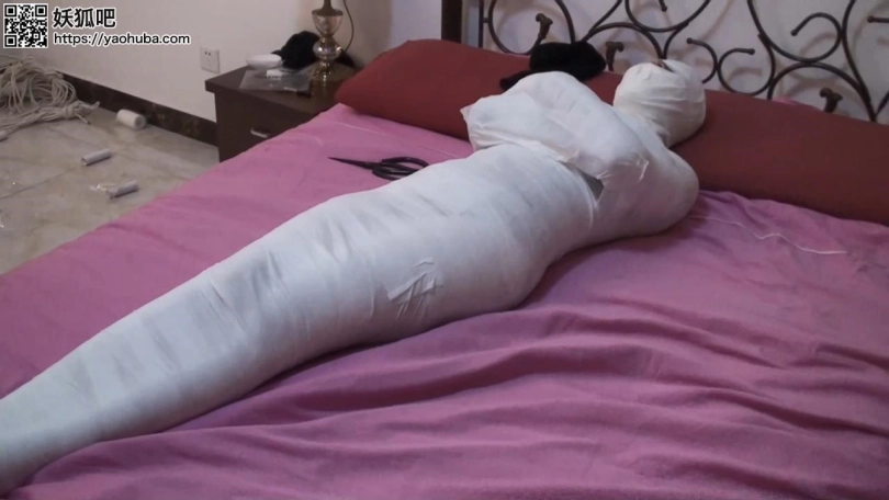 最后,他们合力把李然放在床上,用余下的绷带连李然的脚掌也包起来。经过了20分钟,李然已变成了一具完全的木乃尹在床上扭动,夏炎不禁在床上抱住木乃伊玩弄一会。劫匪把一把剪刀放在木乃伊身旁,嘲笑可以用来自救后就离开。留下来的李然不停挣扎扭动,在股绳的折磨下只能不断发出闷叫声,在黑暗中等待来救她的人。