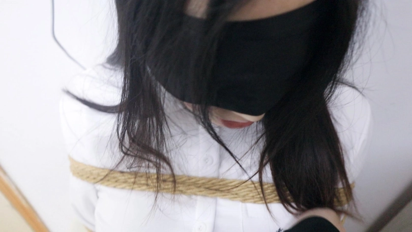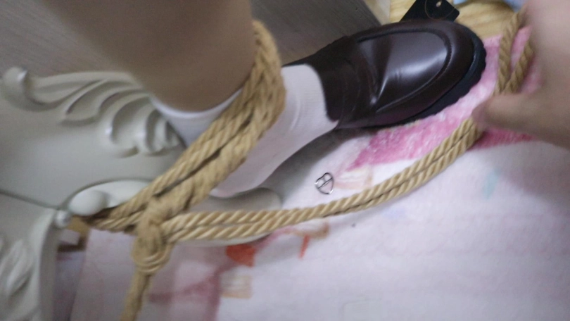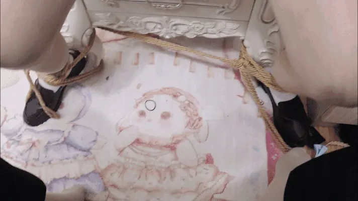 穿着皮鞋的白棉袜双脚被固定在床头柜的两个柱子上剥夺感官