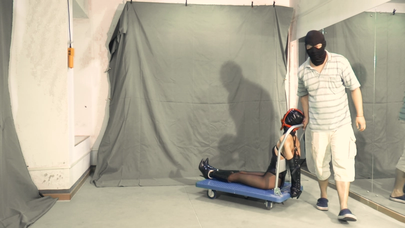 穿着橡胶的奴隶拘留服束缚着身体的赵雪无力地蹲坐在地上。