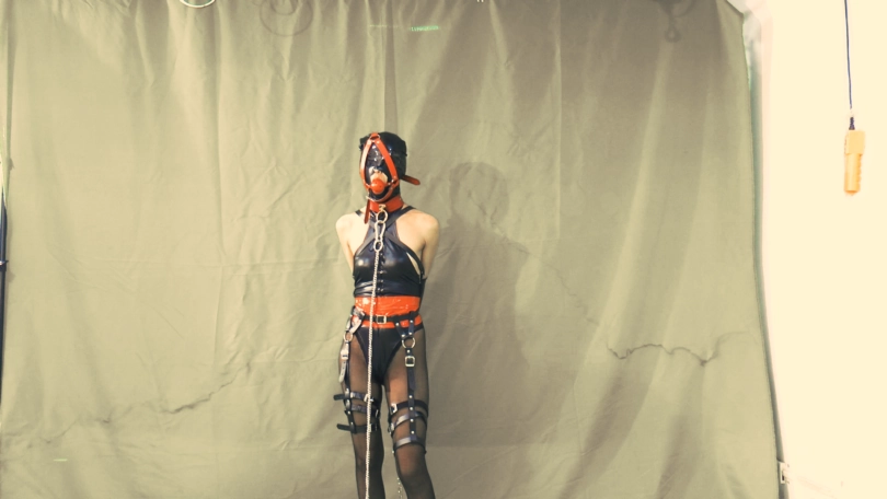 1.踏步时候的 装备 T字高叉 无档丝袜 单手套 头套 脚镣 马具口塞 腿拘束衣