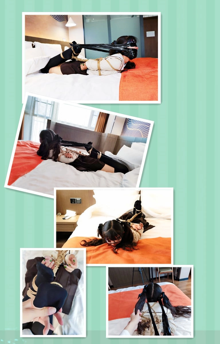 SET1 因为是临时起意决定要拍捆绑的,所以绳子带的并不是很够,好在妹子比较娇小,还是完成了日式驷马~妹子的小嘴也被用妹子自己穿了一天的袜子塞的满满的,并且用胶带封住~
