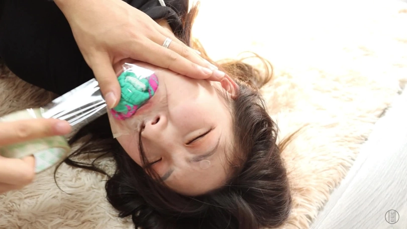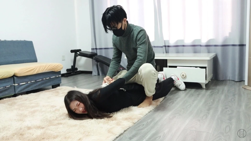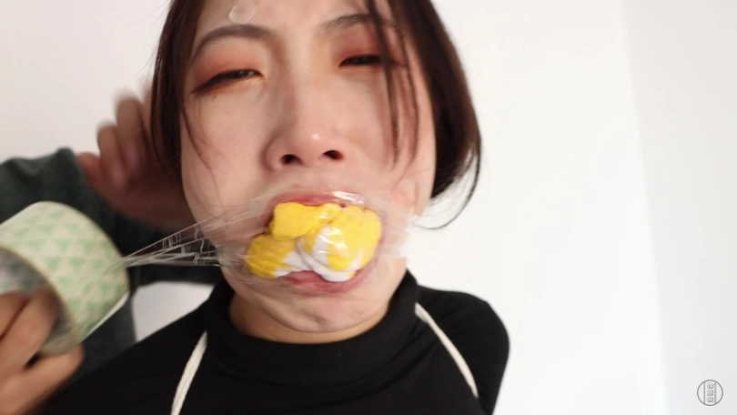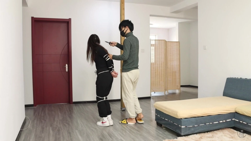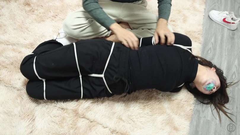 模特安安出演 女小偷进屋盗窃,被埋伏好的屋主抓到并摁在地上进行捆绑,先是直臂缚捆绑好后,逼迫她一蹦一跳的到房间,然后逼她张开嘴把后,塞了袜子再堵上,待屋主离开后,她又想逃跑,失败被抓回,各种TK,多种堵嘴,最后带口球进行口水收集。